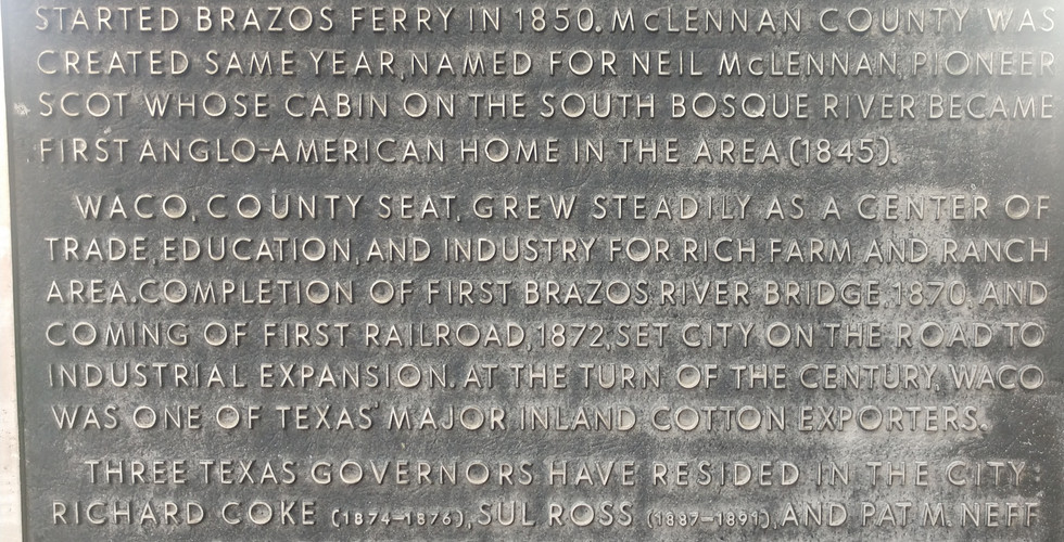 A little on the city itself. Waco is the county seat of Mclennan County. It is on the Brazos river, and get it's name from the Waco (or Huaco) Indians that were living here when Europeans first moved into the area.